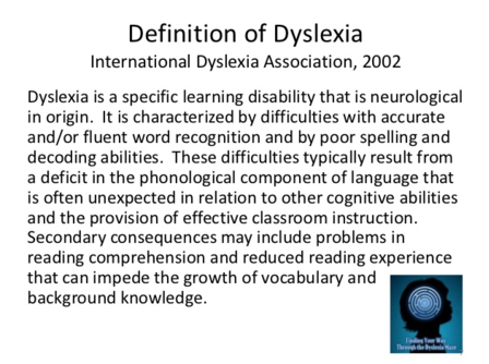 It is characterized by difficulties with accurate andor fluent word recognition and by poor spelling and decoding abilities. Dyslexia is a learning difficulty that primarily affects the skills involved in accurate and fluent word reading and spelling. Dyslexia is a difficulty interpreting the phonological components of our language.
